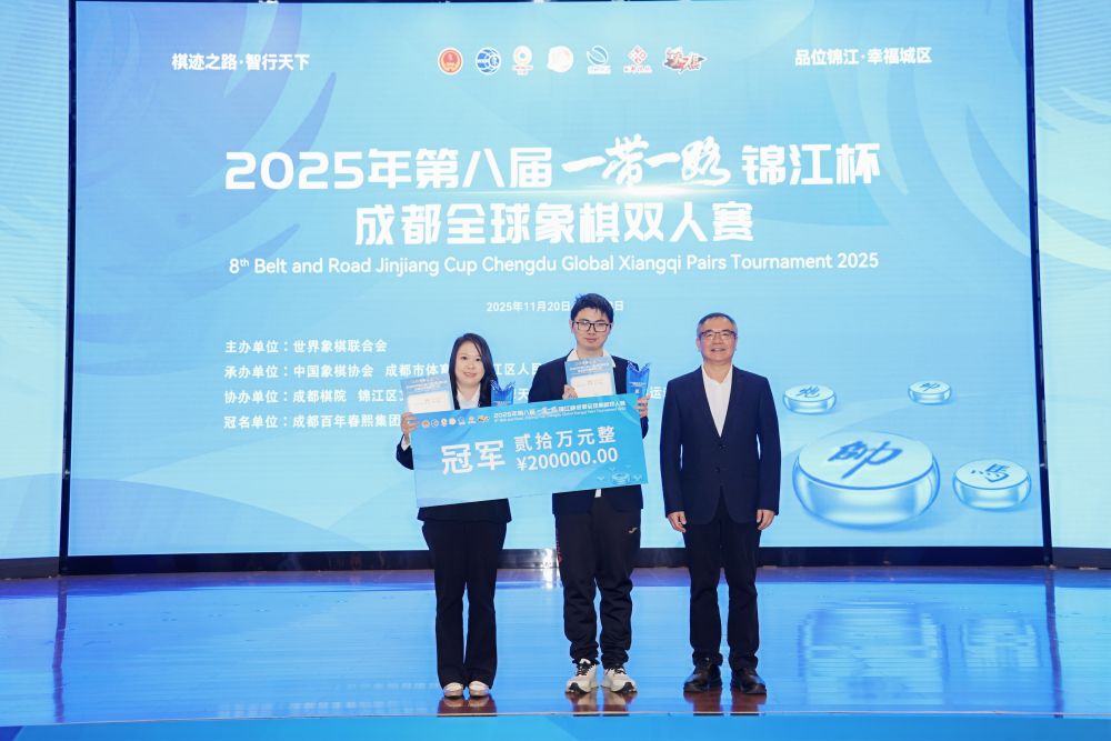 新华社成都11月23日电(记者陈地)23日,2025年第八届锦江杯成都全球象棋双人赛在成都锦江宾馆收官。经过四天的激烈较量,中国队的尹昇与中国香港女棋手林嘉欣组合击败新加坡棋手吴宗翰与中国队王禹博组合,夺得冠军。 据了解,本届赛事以“棋迹之路,智行天下”为主题,共有来自18个国家和地区的32位棋手参赛。赛制设置兼具竞技性与观赏性,通过单人快棋赛将参赛棋手分为“红帅组”与“黑将组”并决出名次,随后两两组队展开为期三天的六轮循环赛。 循环赛后,吴宗翰/王禹博组合与林嘉欣/尹昇组合分列前两位,在决赛中相遇。最终,林嘉欣/尹昇组合凭借关键时刻的稳健发挥笑到最后,斩获冠军,越南女棋手阮黄燕与成都棋手许文章组合收获季军。 喜获冠军的林嘉欣开心地说:“不真实,不真实!厉害的棋手非常多,我抱着学习的心态过来的,没有想太多。抽签分组情况出来之后,我的目标应该是进个前八名就满意了,现在真的很激动!” 而在最后一轮比赛结束后,赛场上还出现了暖心的一幕。保加利亚棋手谭思特献给他的搭档、象棋大师梁妍婷一束玫瑰花(玫瑰花是保加利亚的国花),并非常工整地用中文写下“谢谢你和我一起下象棋”。